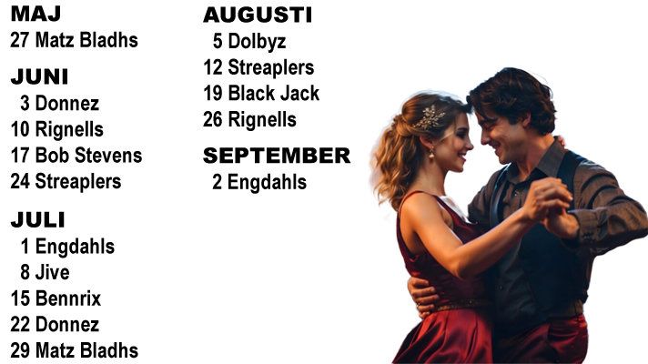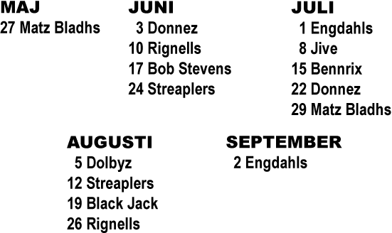 27/5 Matz Bladhs - 3/6 Donnez - 10/6 Rignells -17/6 Bob Stevens - 24/6 Streaplers - 1/7 Engdahls - 8/7 Jive - 15/7 Bennrix